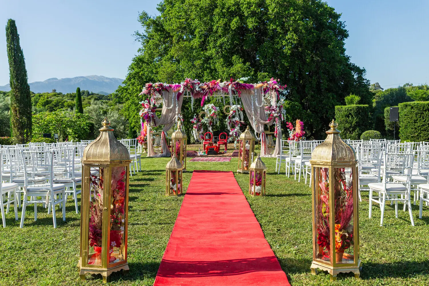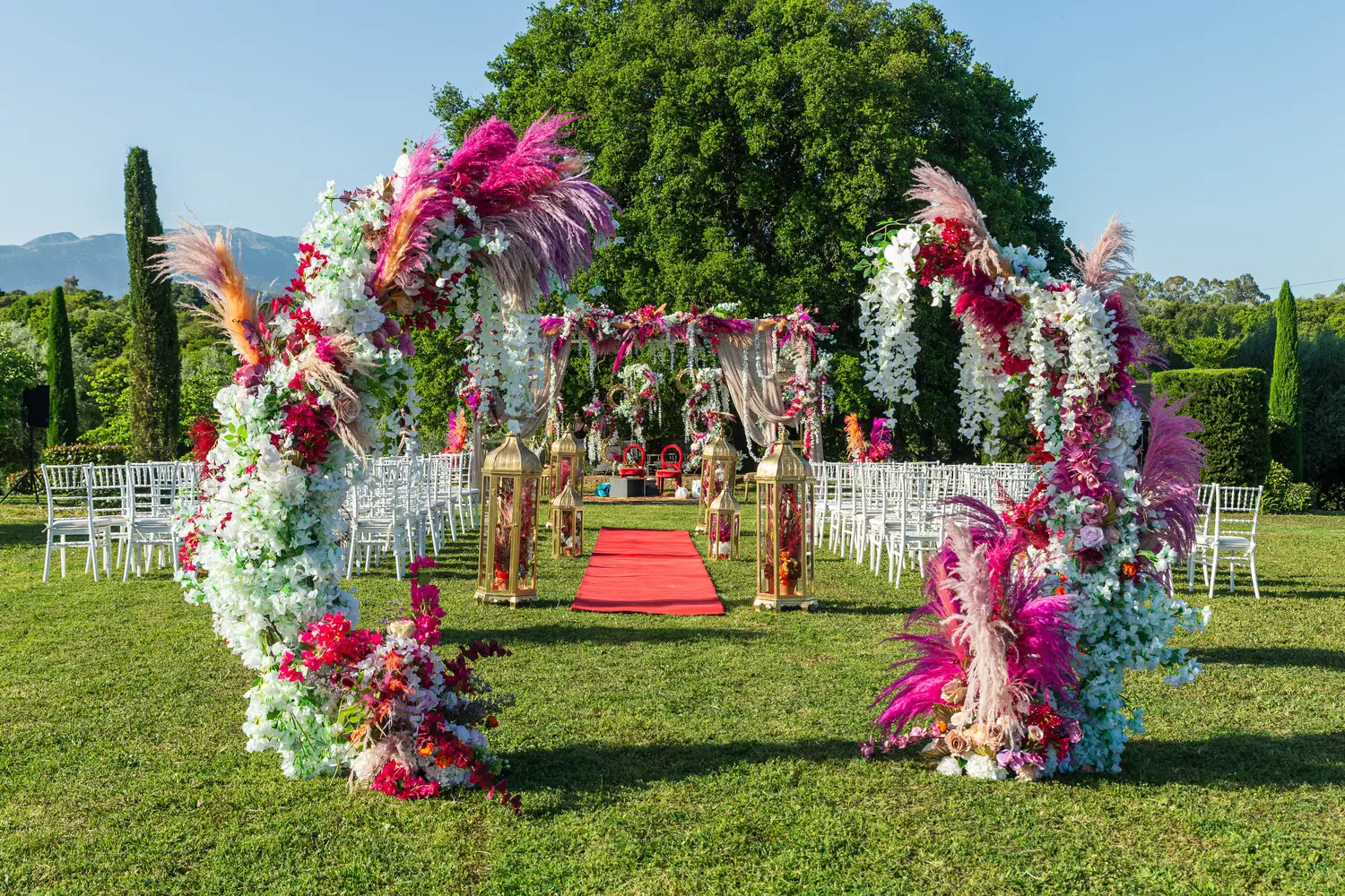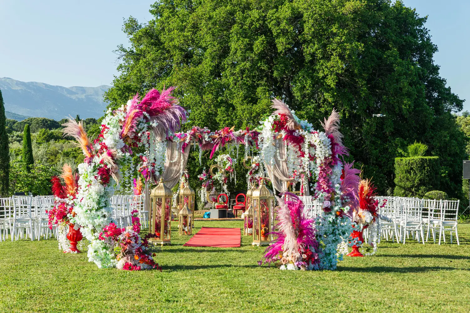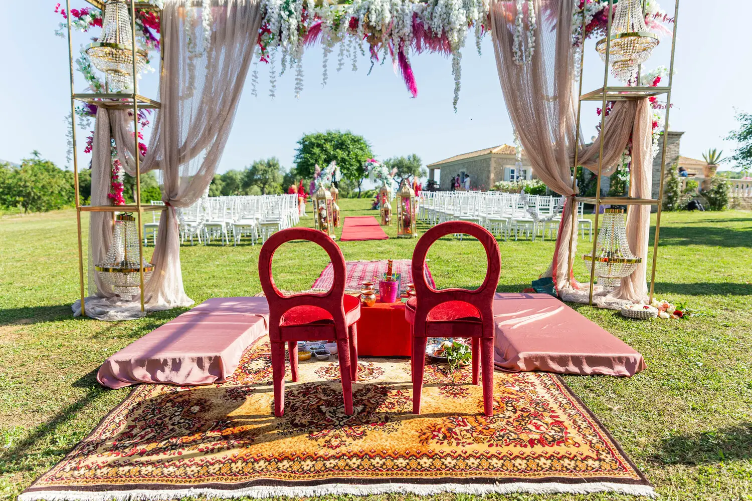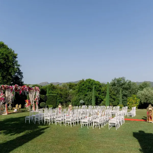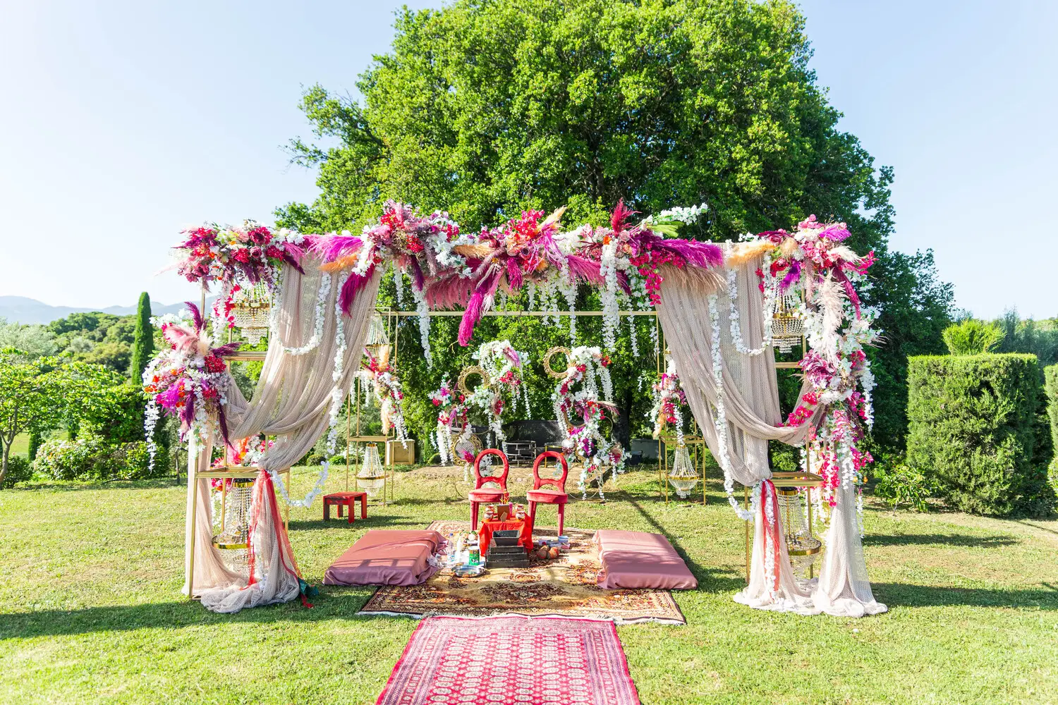 Our villa was transformed with vibrant colors and refined floral artistry, creating an authentic Hindu wedding atmosphere. Traditional symbolic Indian elements were thoughtfully incorporated, harmonizing with the natural Mediterranean surroundings. The lush greenery and breathtaking views provided a spectacular backdrop for the sacred ceremonies.